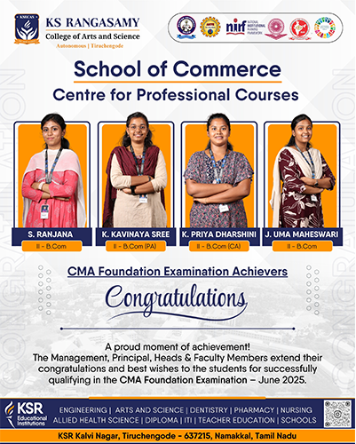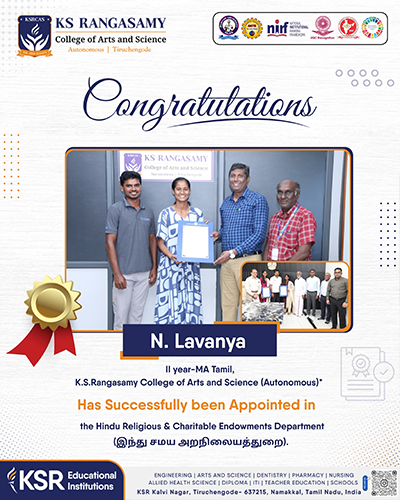 K.S. Rangasamy College of Arts and Science strives to provide quality education by imparting discipline, value, knowledge and skills. We provide a vast array of courses in Life Sciences, Humanities and Management Studies with Co-curricular activities to enhance the soft skills of the students and created an excellent learning environment with positive support and direction for the growth of our students.